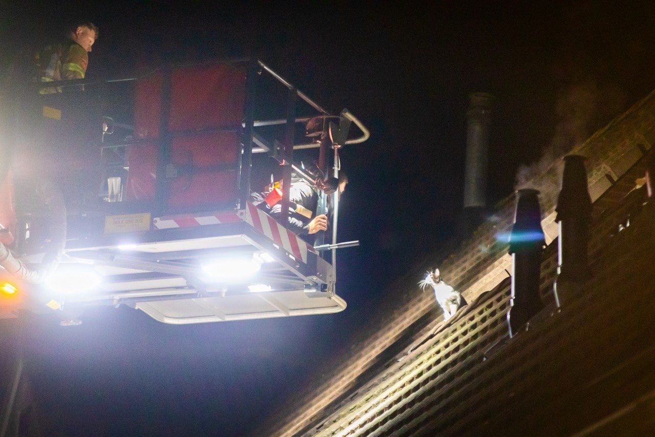 Bij de brandweer gingen daarom rond 21:00 uur de alarmbellen af. In de Stadhouderlaan aangekomen probeerden de brandweerlieden samen met een medewerker van de eveneens opgetrommelde dierenambulance het dier van het dak te krijgen. Tevergeefs, de kat kat bleef angstig op de steile dakpannen zitten.